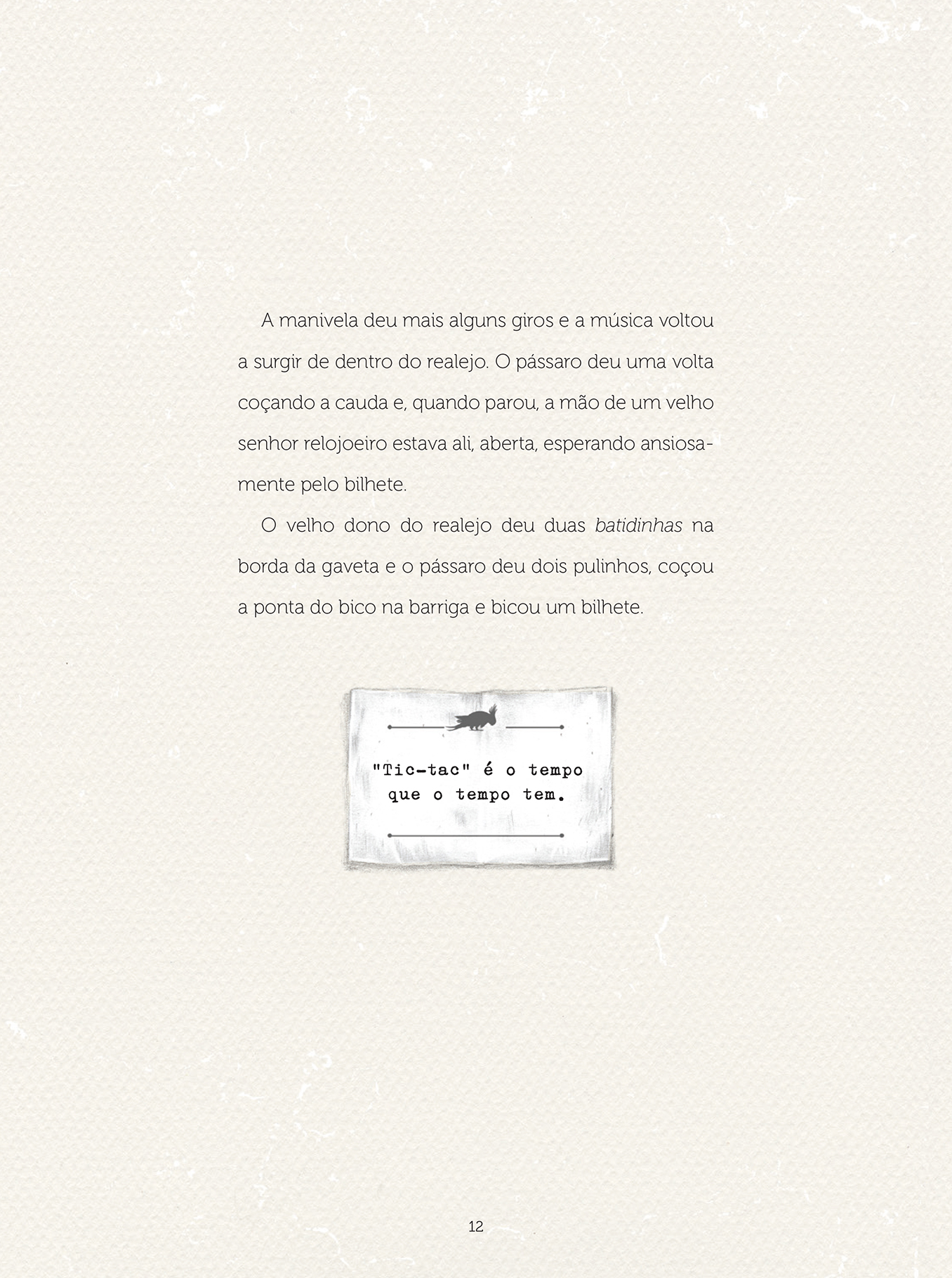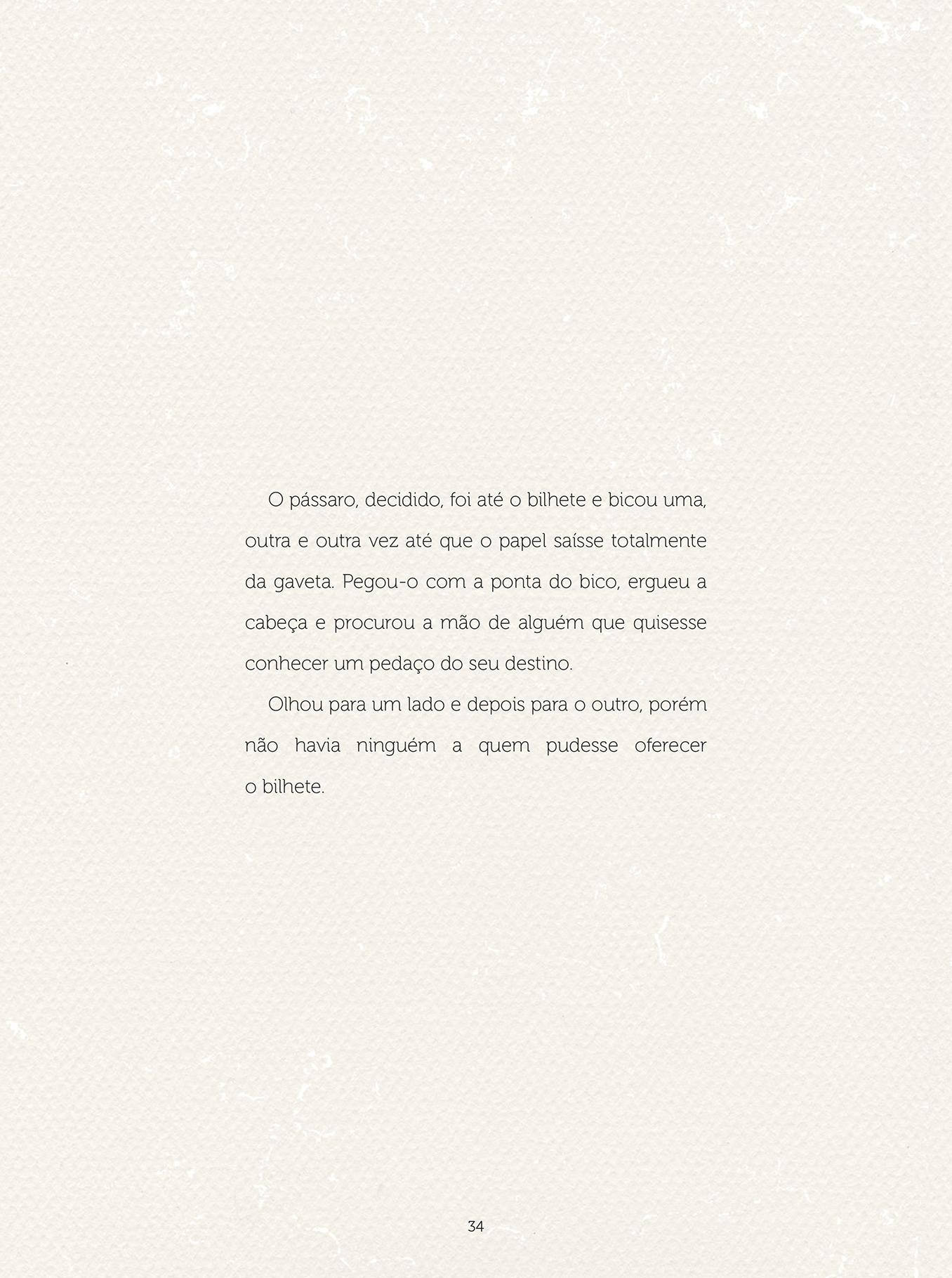 Essa narrativa sensível e encantadora nos mostra sobre as possibilidades da vida. Um realejo que toca e o pássaro que saí para entregar um bilhete e tirar a sorte de quem por ali passar, entregando a eles um pequeno pedaço de destino. Como acreditar naquele bilhete? Será que poderia ser real? Envolvido em suas perguntas enquanto o pai avançava com a leitura, o menino não esperava o final surpreendente do destino do próprio pássaro.