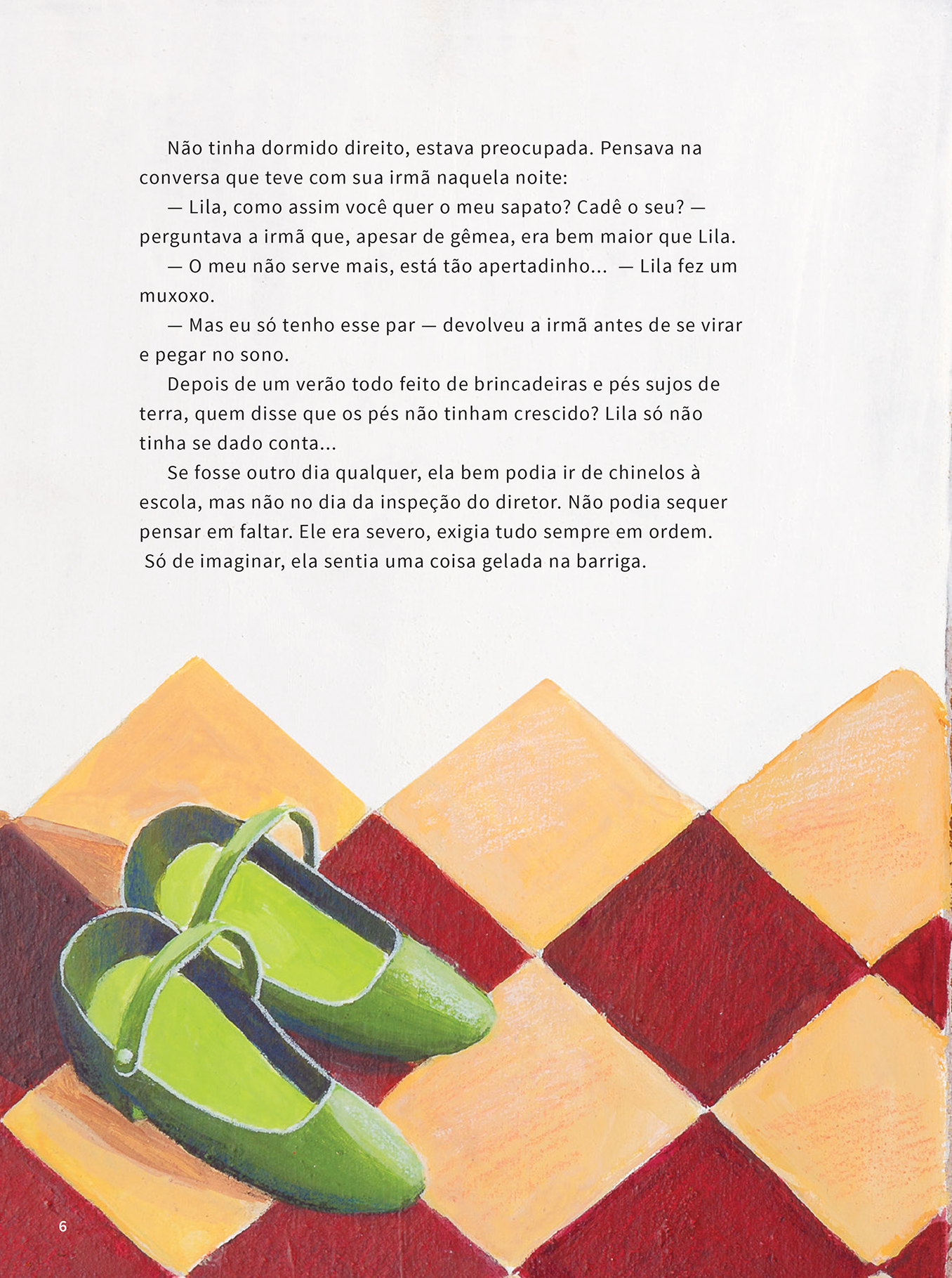 Lila e sua irmã vivem com a família no campo. Um lugar de terra vermelha, fértil, onde a liberdade de brincar descalça sempre fez a alegria das férias. Na volta às aulas, ela percebe que seu único par de sapatos já não serve e precisa de um plano astucioso para chegar à escola e passar pela revista do diretor. O plano é criativo, mas ingênuo ao mesmo tempo, e acaba por levar as irmãs a um desfecho bastante inesperado.