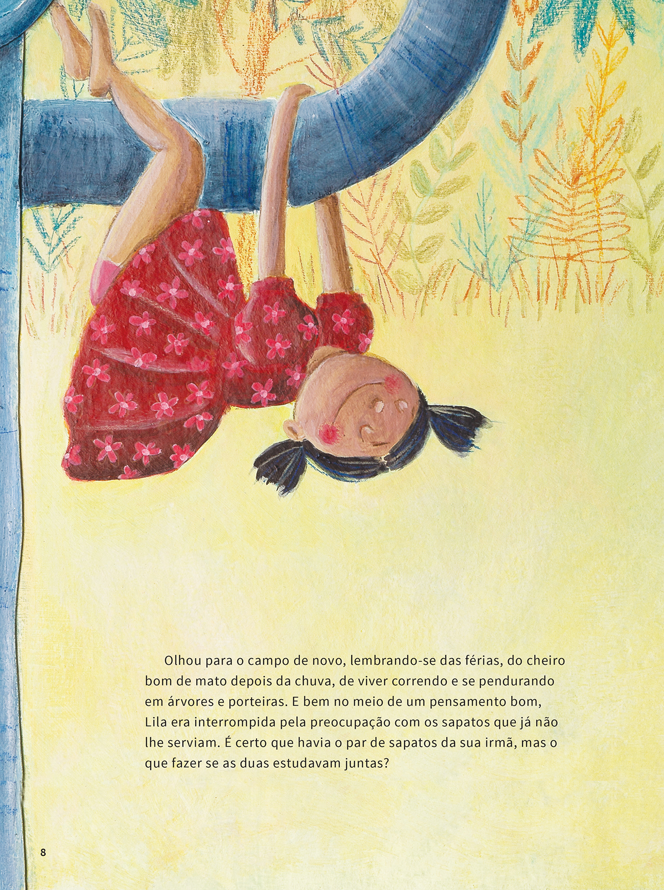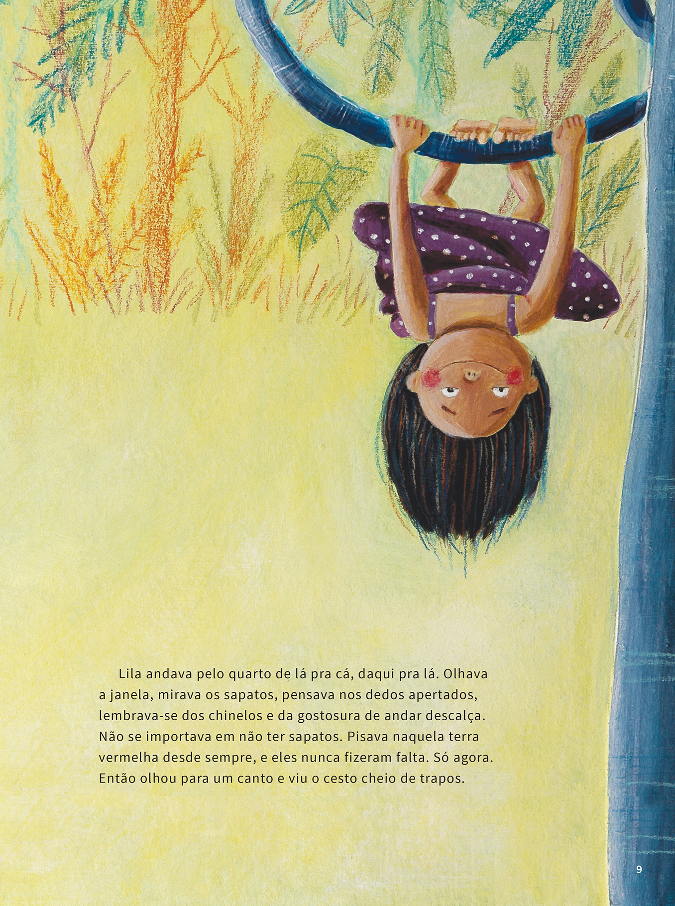 Para as ilustrações, Ionit Zilberman escolheu uma técnica que mistura materias como terra, cola, colorau, água, gesso, tinta acrílica, lápis de cor e tecido, produzindo efeitos e texturas únicos para cada página.